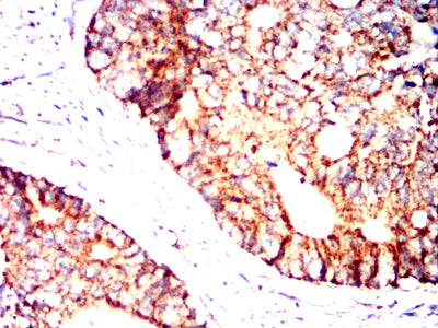 Immunohistochemical analysis of paraffin-embedded rabbit kidney tissues using IRF3 mouse mAb with DAB staining.