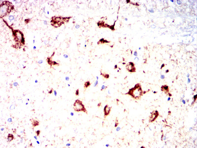 Immunohistochemical analysis of paraffin-embedded Rabbit spinal cord tissues using ZP2 mouse mAb with DAB staining.