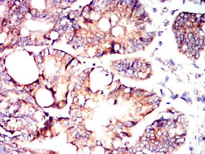 Immunohistochemical analysis of paraffin-embedded human breast cancer tissues using ZP2 mouse mAb with DAB staining.