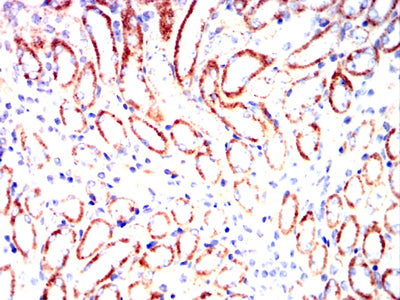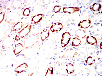 Immunohistochemical analysis of paraffin-embedded Rabbit kidney tissues using ZP2 mouse mAb with DAB staining.
