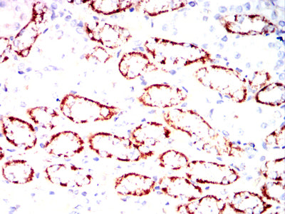 Immunohistochemical analysis of paraffin-embedded mouse kidney tissues using ZP2 mouse mAb with DAB staining.