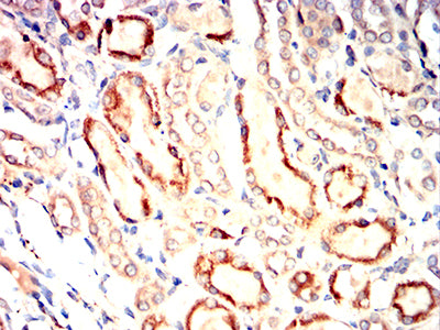 Immunohistochemical analysis of paraffin-embedded rat kidney tissues using UCHL1 mouse mAb with DAB staining.