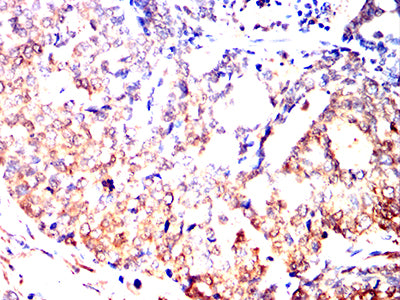 Immunohistochemical analysis of paraffin-embedded human lung cancer tissues using UCHL1 mouse mAb with DAB staining.