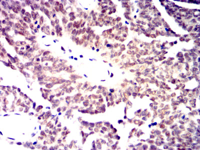Immunohistochemical analysis of paraffin-embedded human ovarian cancer tissues using MRE11 mouse mAb with DAB staining.