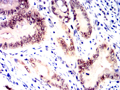 Immunohistochemical analysis of paraffin-embedded human rectal cancer tissues using MRE11 mouse mAb with DAB staining.