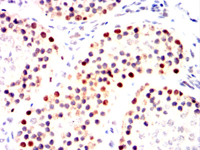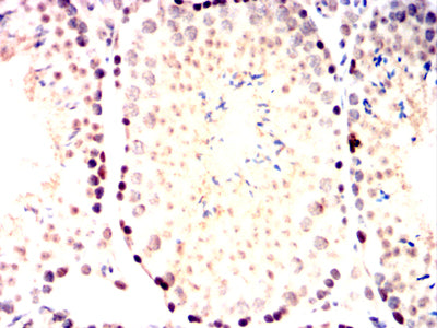 Immunohistochemical analysis of paraffin-embedded Mouse testis tissues using MRE11 mouse mAb with DAB staining.