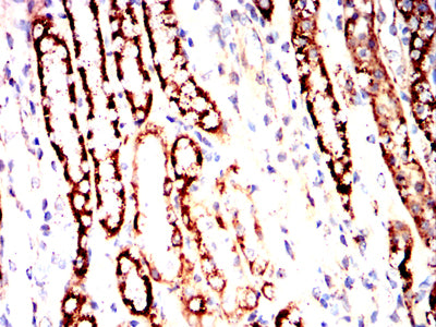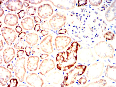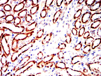 Immunohistochemical analysis of paraffin-embedded mouse kidney tissues using PDHA1 mouse mAb with DAB staining.