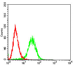 Flow cytometric analysis of Hela cells using PDHA1 mouse mAb (green) and negative control (red).
