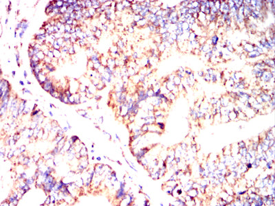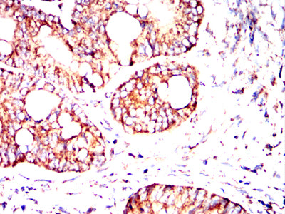 Immunohistochemical analysis of paraffin-embedded human colon cancer tissues using PDHA1 mouse mAb with DAB staining.