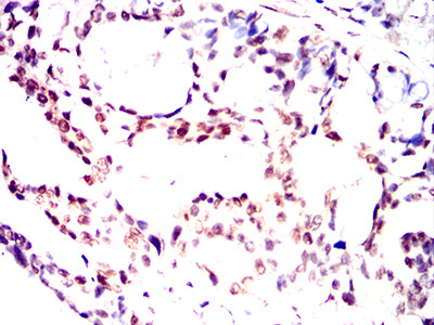 Immunohistochemical analysis of paraffin-embedded human rectum cancer tissues using MRE11 mouse mAb with DAB staining.