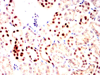 Immunohistochemical analysis of paraffin-embedded rat kidney tissues using MRE11 mouse mAb with DAB staining.