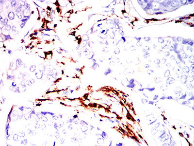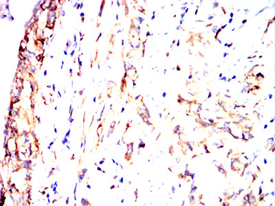Immunohistochemical analysis of paraffin-embedded human gastric cancer tissues using HLA-DPA1 mouse mAb with DAB staining.