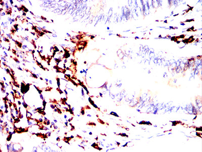 Immunohistochemical analysis of paraffin-embedded human rectal cancer tissues using HLA-DPA1 mouse mAb with DAB staining.