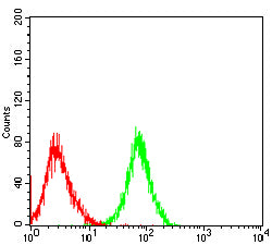 Flow cytometric analysis of COS-7 cells using ATM mouse mAb (green) and negative control (red).