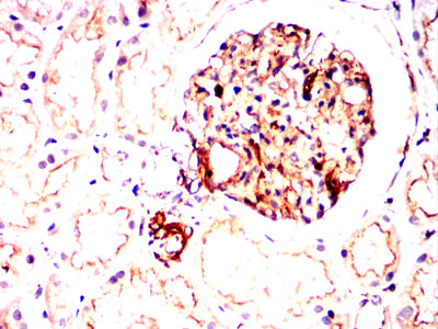Immunohistochemical analysis of paraffin-embedded human kidney tissues using ATM mouse mAb with DAB staining.