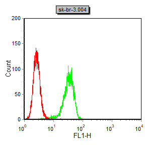 Flow cytometric analysis of SK-BR-3 cells using CD28 mouse mAb (green) and negative control (red).