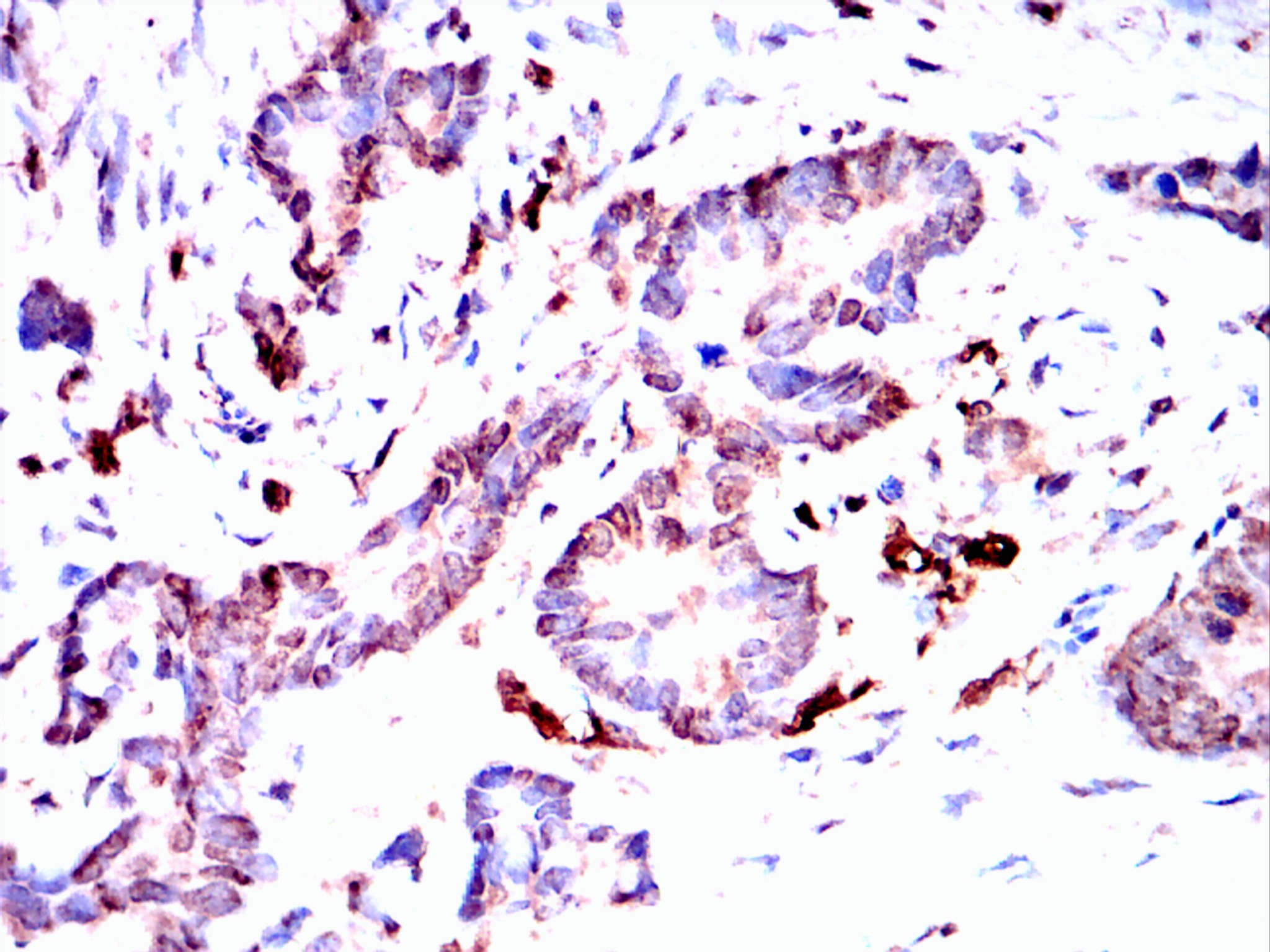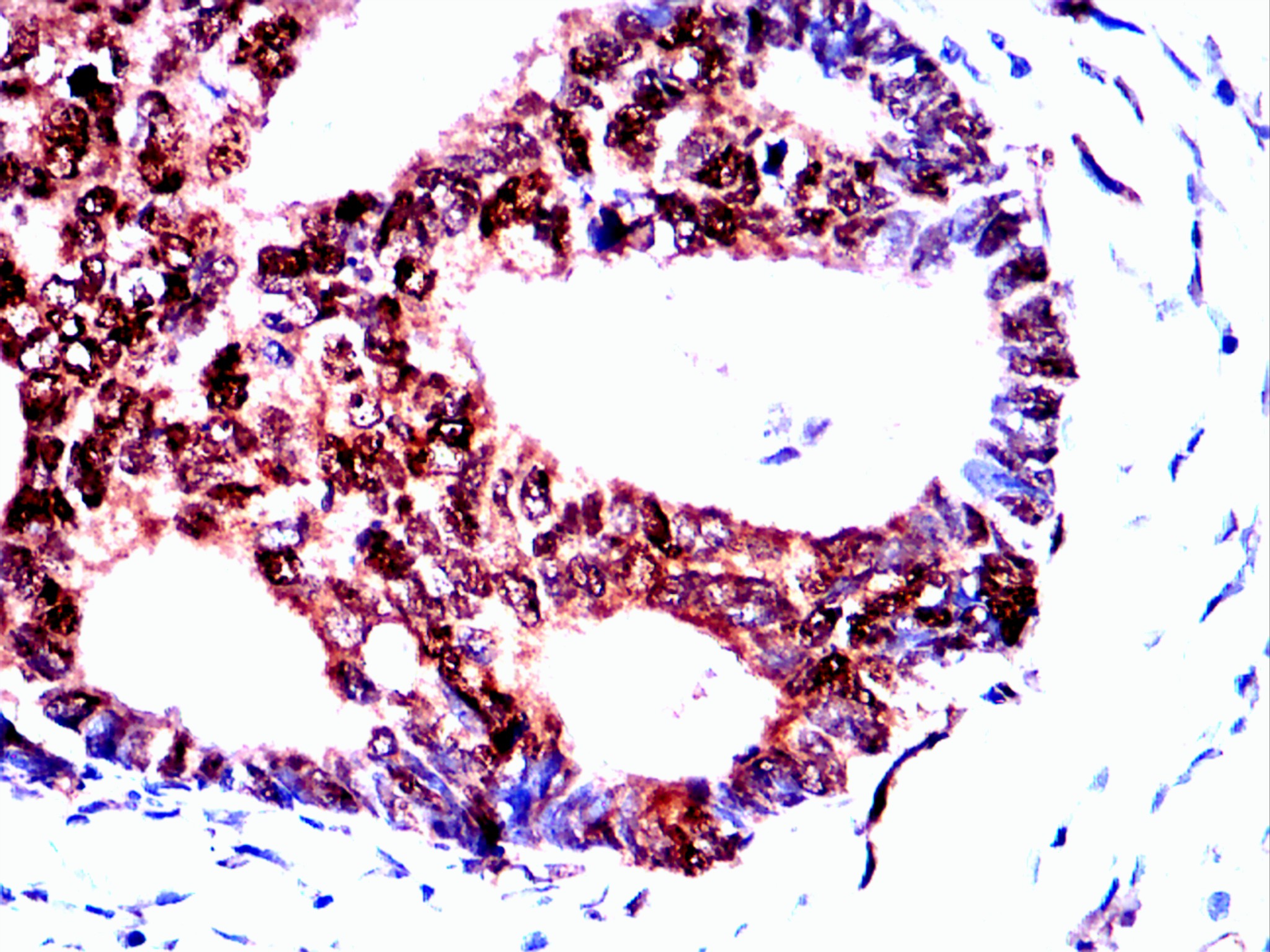 Immunohistochemical analysis of paraffin-embedded colon cancer tissues using Visfatin(PBEF) mouse mAb with DAB staining.