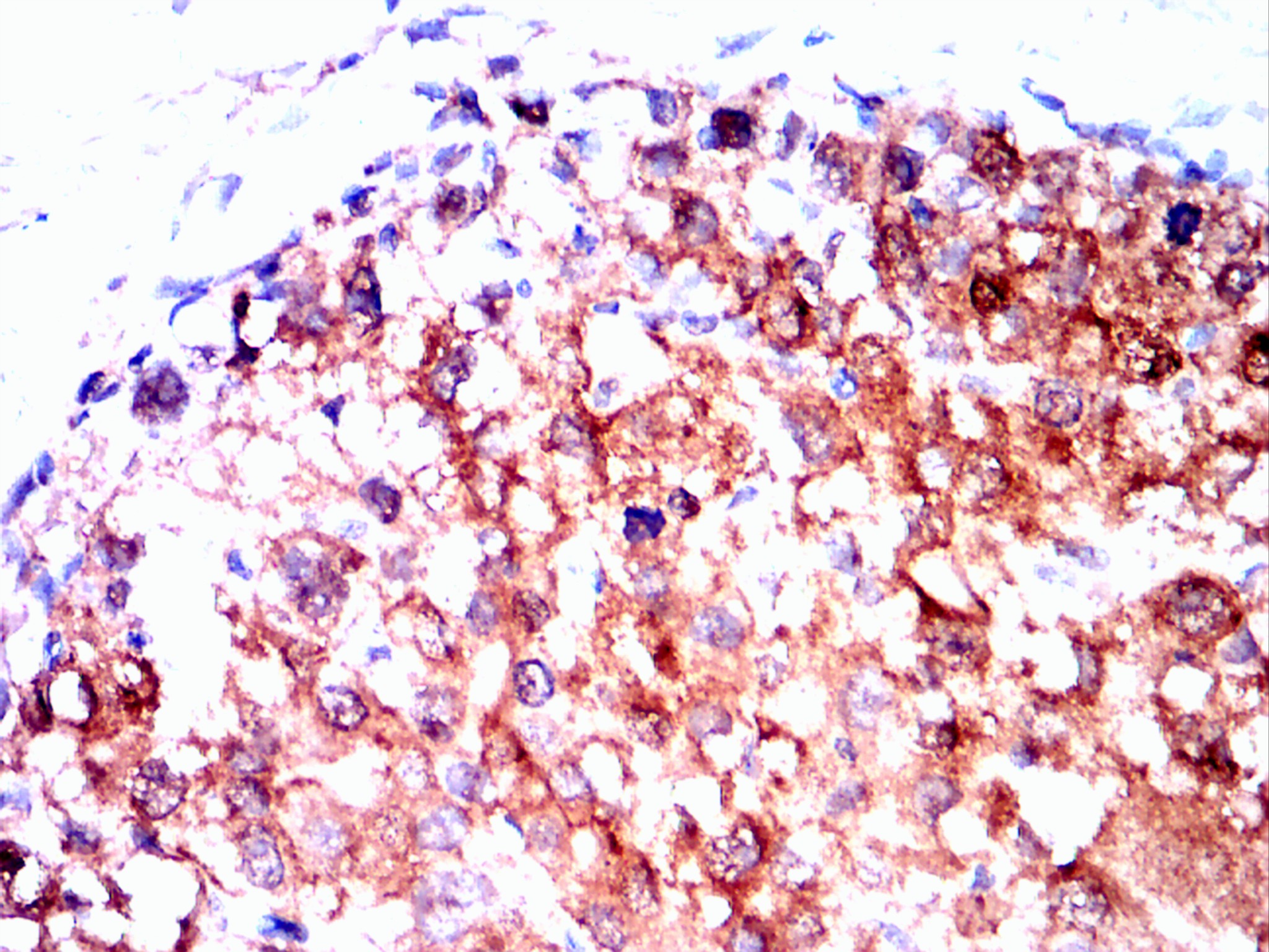 Immunohistochemical analysis of paraffin-embedded rectum cancer tissues using Visfatin(PBEF) mouse mAb with DAB staining.