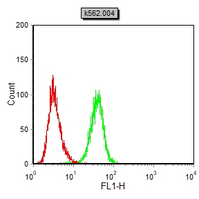 Flow cytometric analysis of K562 cells using Visfatin(PBEF) mouse mAb (green) and negative control (red).