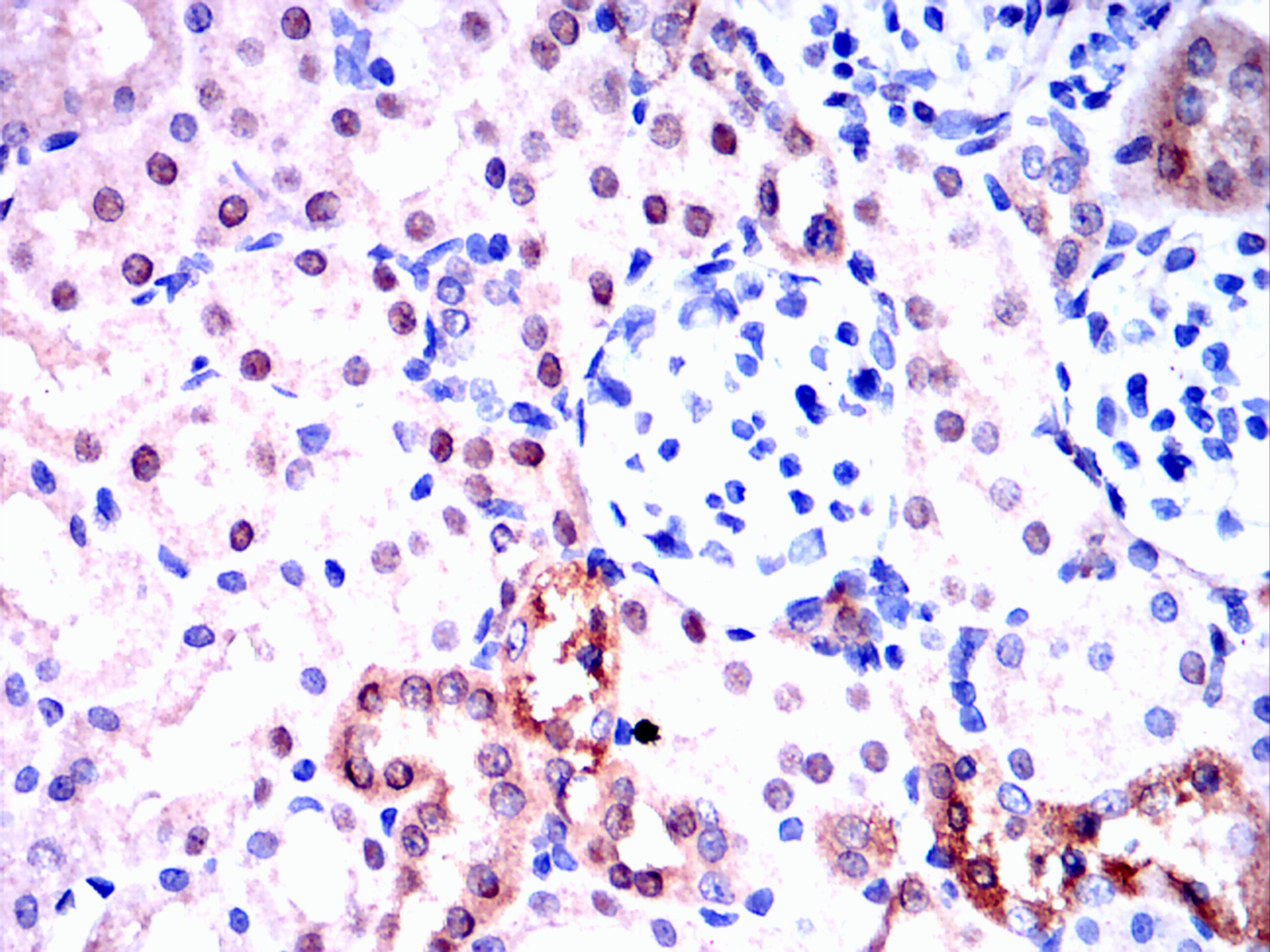 Immunohistochemical analysis of paraffin-embedded rat kidney tissues using Visfatin(PBEF) mouse mAb with DAB staining.