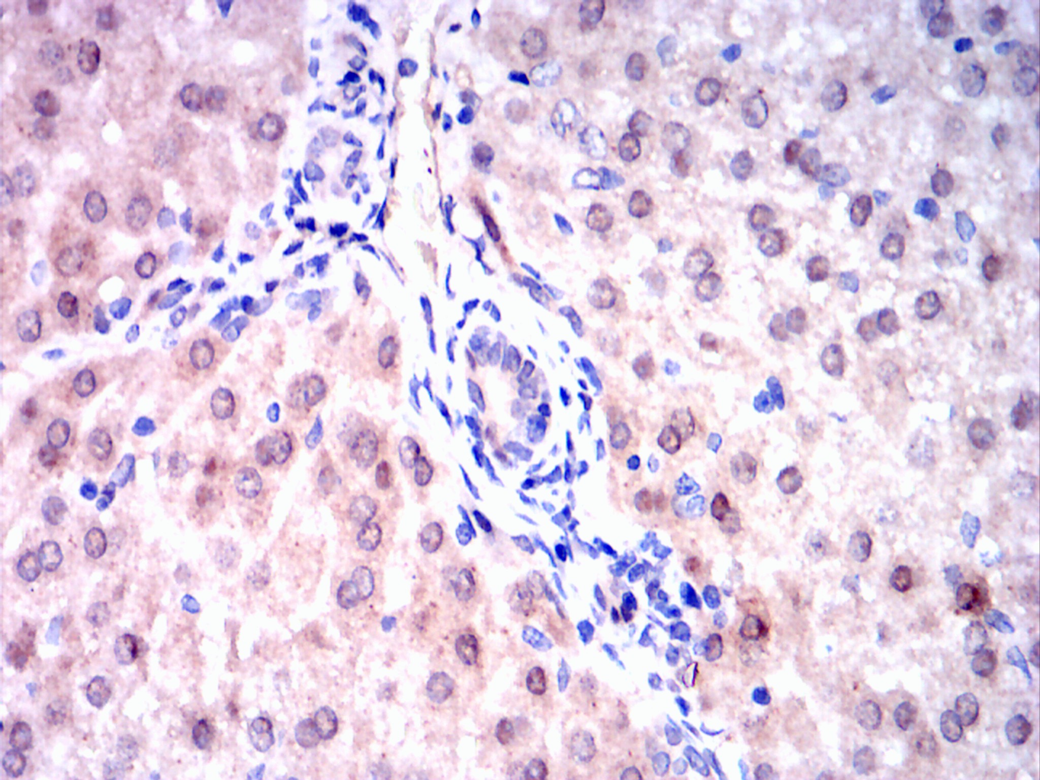 Immunohistochemical analysis of paraffin-embedded rabbit liver tissues using Visfatin(PBEF) mouse mAb with DAB staining.