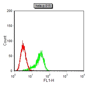 Flow cytometric analysis of hela cells using MAP4K4 mouse mAb (green) and negative control (red).