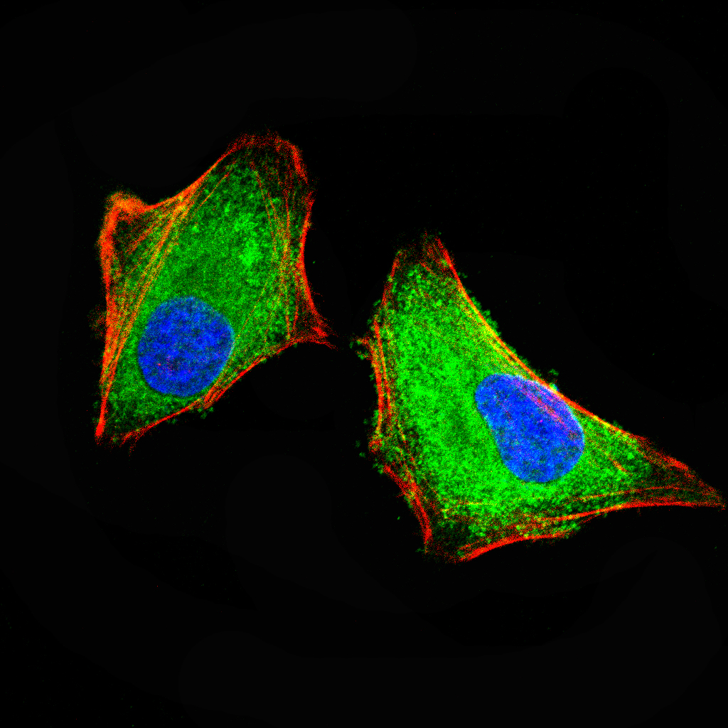 Immunofluorescence analysis of hela cells using MAP4K4 mouse mAb (green). Red: Actin filaments have been labeled with Alexa Fluor-555 phalloidin.
