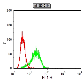 Flow cytometric analysis of NIH3T3 cells usingProteinase 3 mouse mAb (green) and negative control (red).