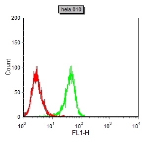 Flow cytometric analysis of hela cells usingProteinase 3 mouse mAb (green) and negative control (red).