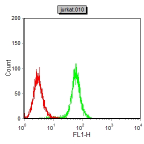 Flow cytometric analysis of jurkat cells usingProteinase 3 mouse mAb (green) and negative control (red).