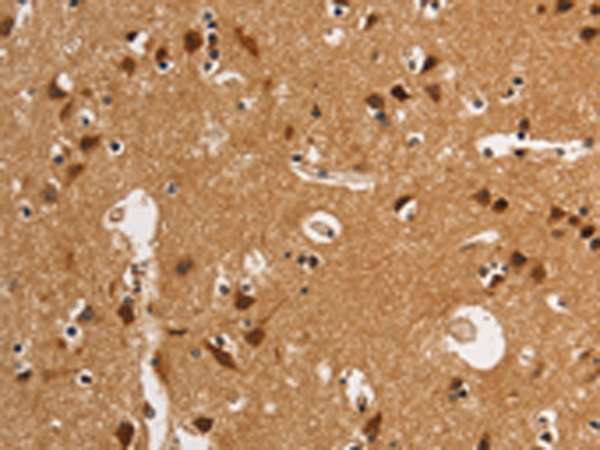 The image is immunohistochemistry of paraffin-embedded Human brain tissue using P04286(ANAPC4 Antibody) at dilution 1/50. (Original magnification: ×200)
