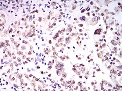 Immunohistochemical analysis of paraffin-embedded human endometrial cancer tissues using HNRNPU mouse mAb with DAB staining.