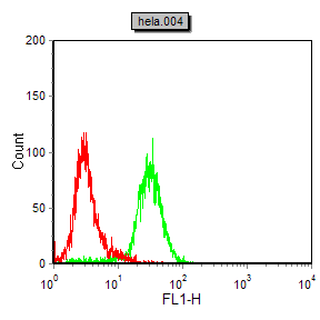 Flow cytometric analysis of Hela cells using HSPA5 mouse mAb (green) and negative control (red).