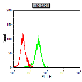Flow cytometric analysis of NIH/3T3 cells using HSPA5 mouse mAb (green) and negative control (red).