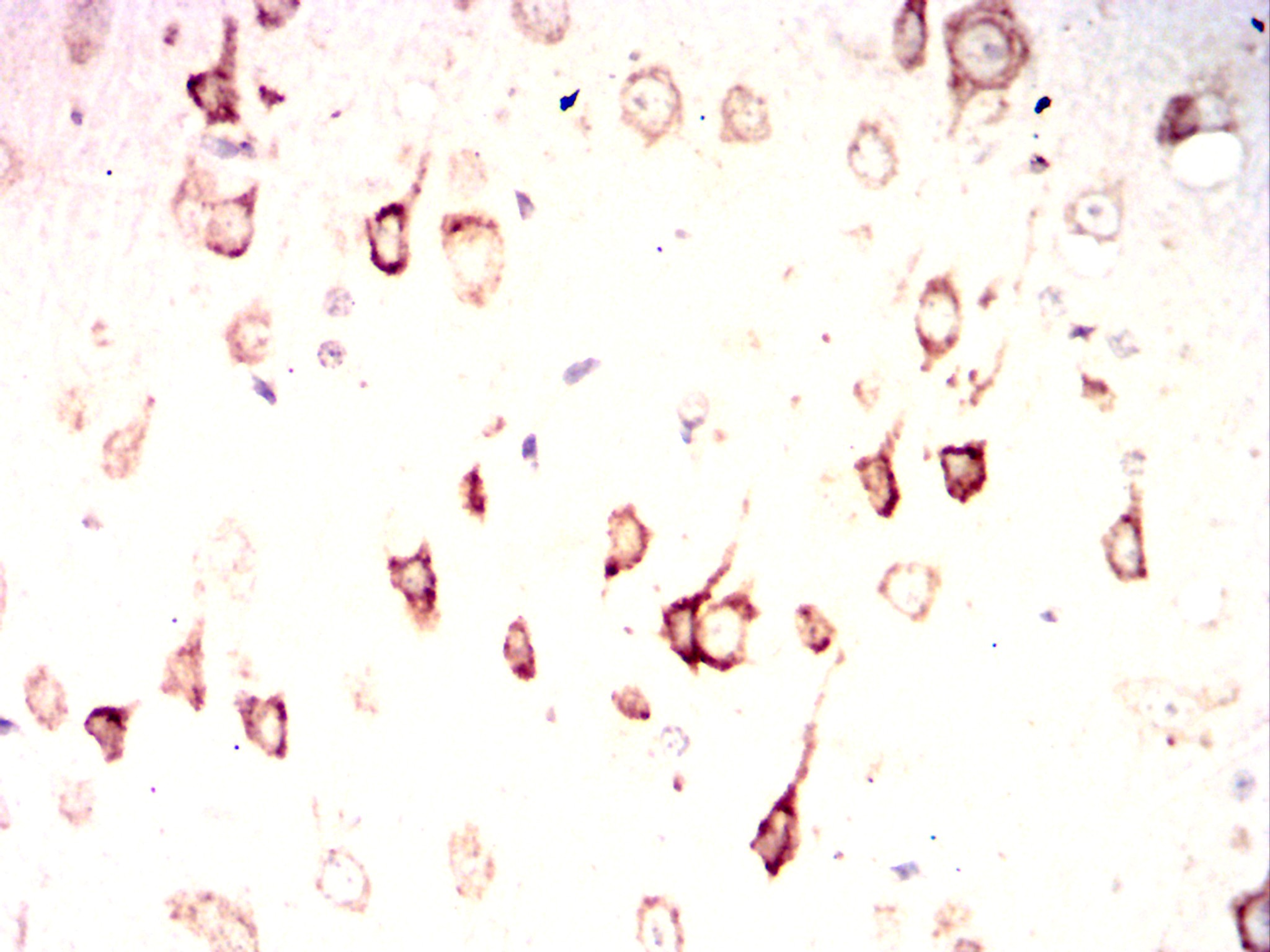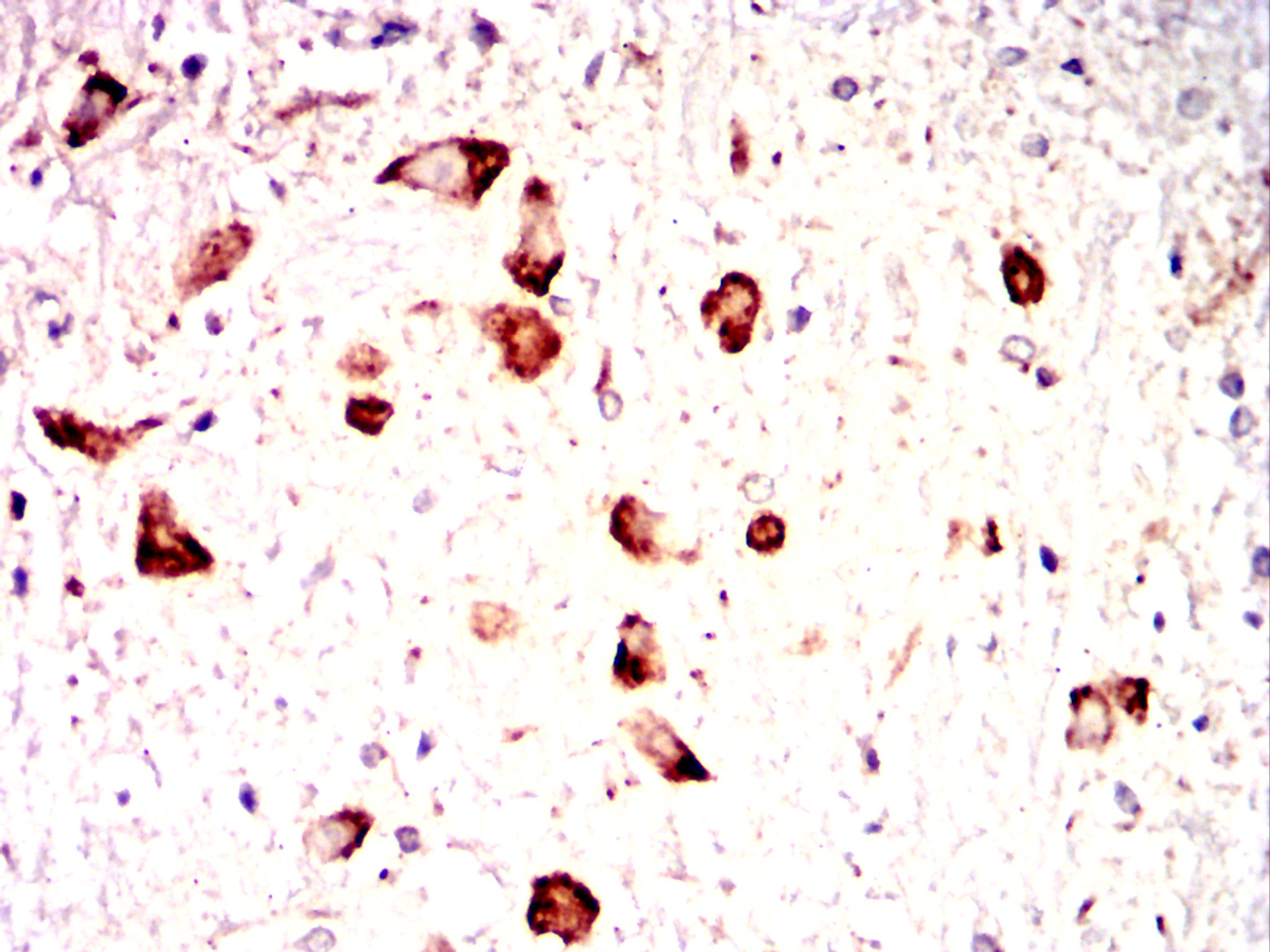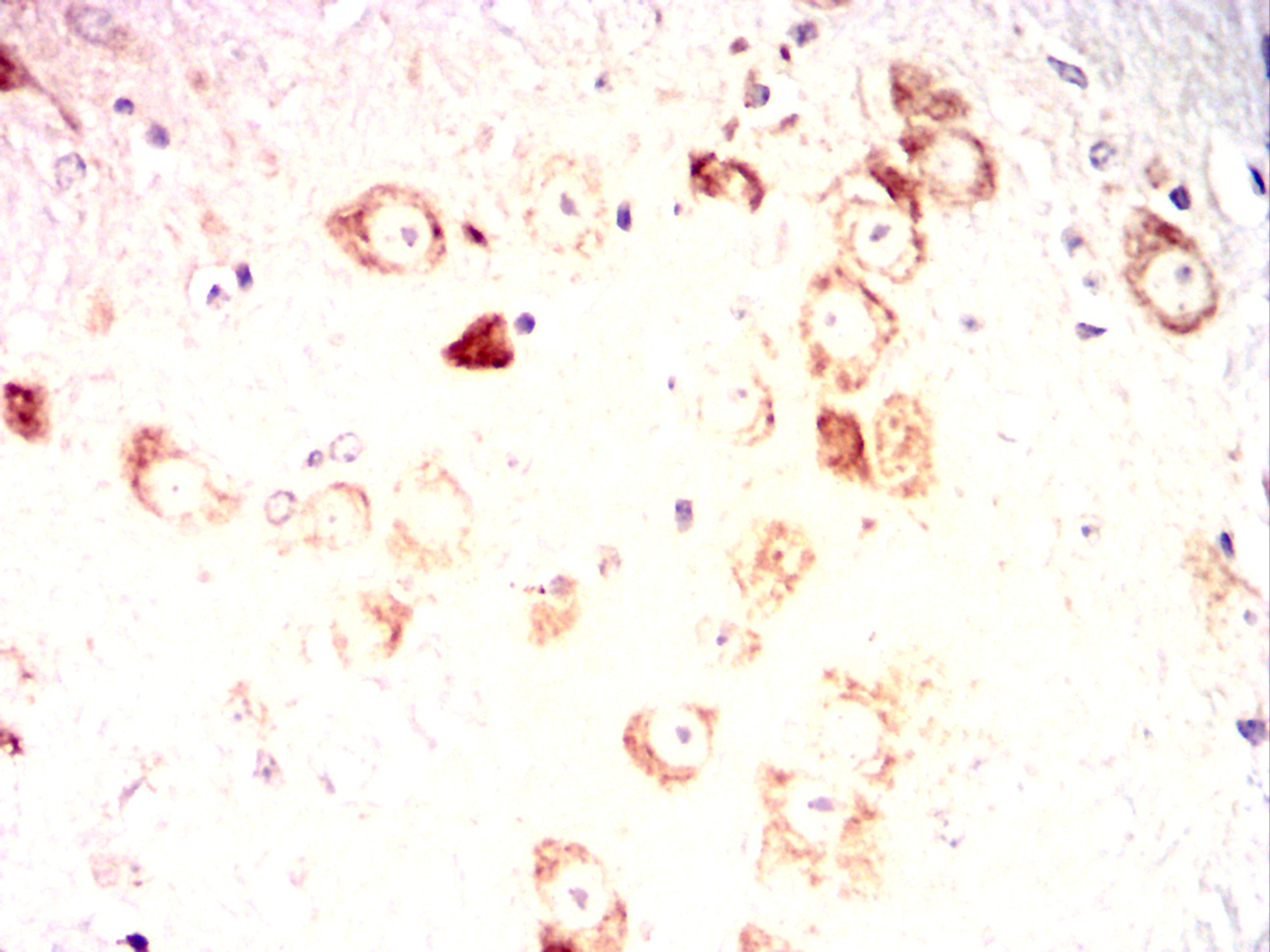 Immunohistochemical analysis of paraffin-embedded Rabbit spinal cord using HSPA5 mouse mAb with DAB staining.
