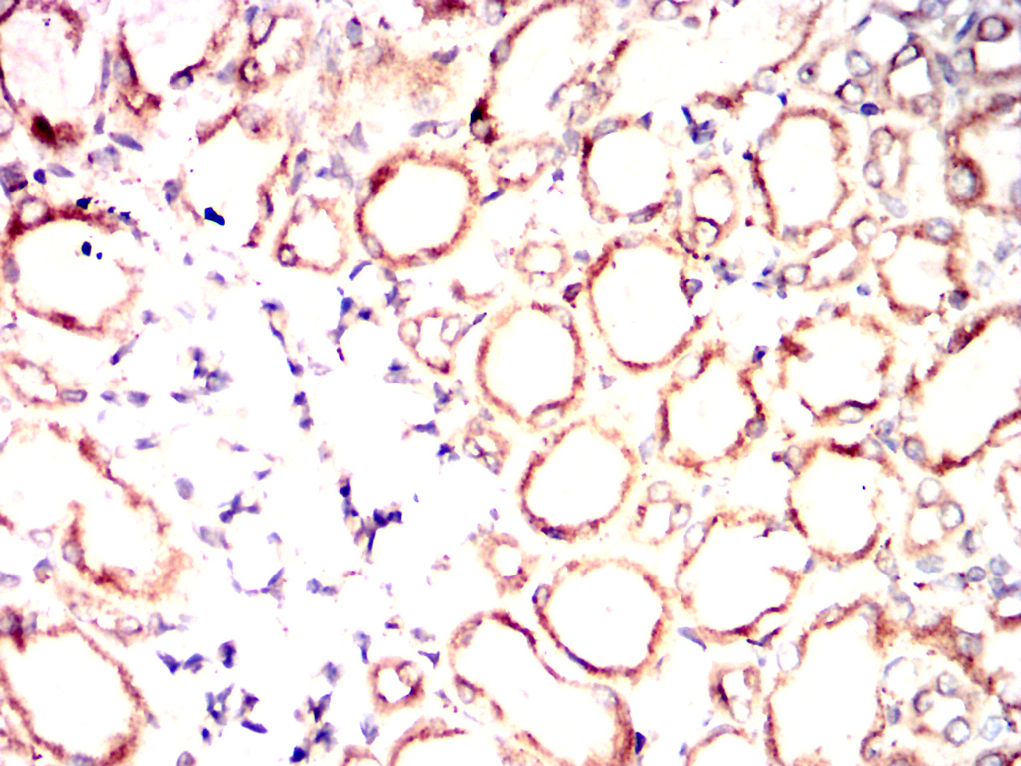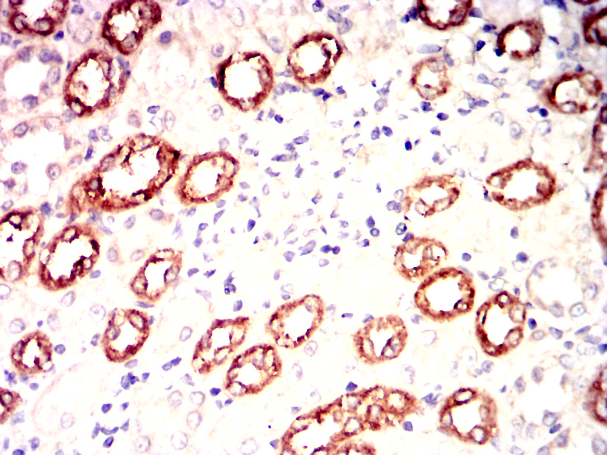 Immunohistochemical analysis of paraffin-embedded Rabbit kidney using HSPA5 mouse mAb with DAB staining.