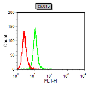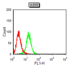 Flow cytometric analysis of NIH/3T3 cells using CDH2 mouse mAb (green) and negative control (red).
