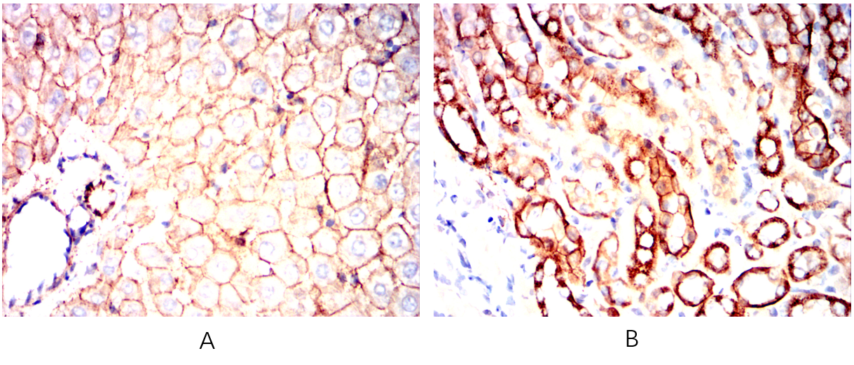 Immunohistochemical analysis of paraffin-embedded Mouse liver(A)Mouse kidney(B) using CDH2 mouse mAb with DAB staining.