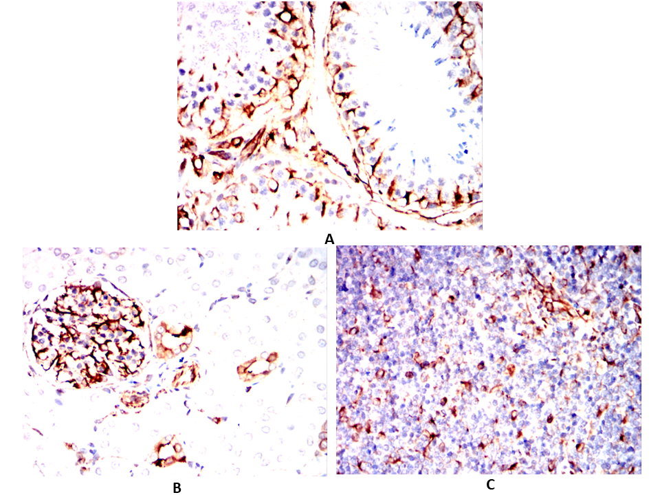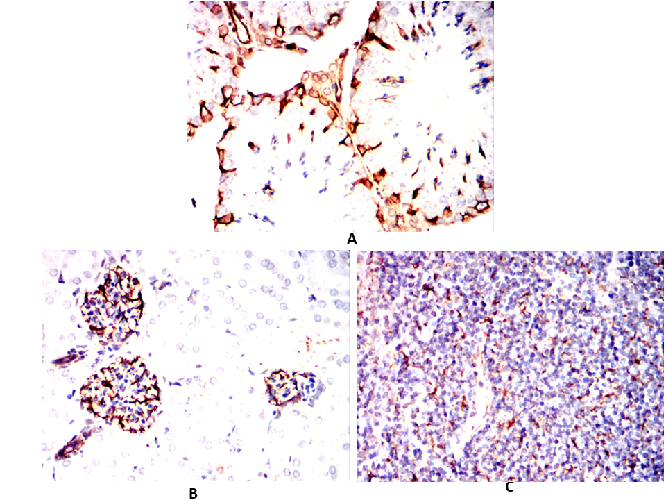 Immunohistochemical analysis of paraffin-embedded Rabbit testicles(A)Rabbit kidney(B)Rabbit thymus(C) using CD276 mouse mAb with DAB staining.