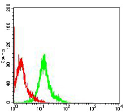 Flow cytometric analysis of COS7 cells using SOX2 mouse mAb (green) and negative control (red).