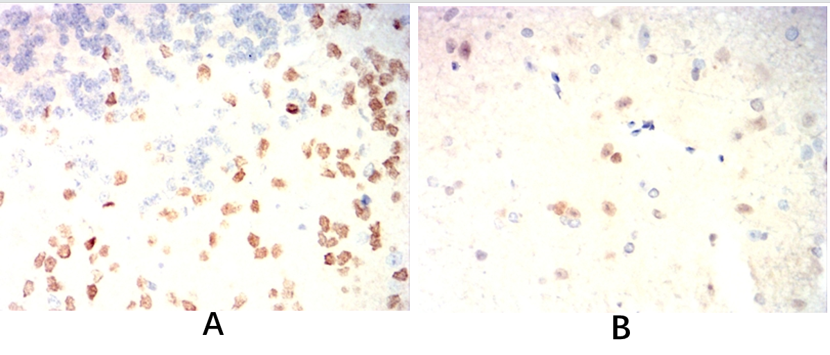 Immunohistochemical analysis of paraffin-embedded Rat brain(A) Rat cerebellum(B) using SOX2 mouse mAb with DAB staining.