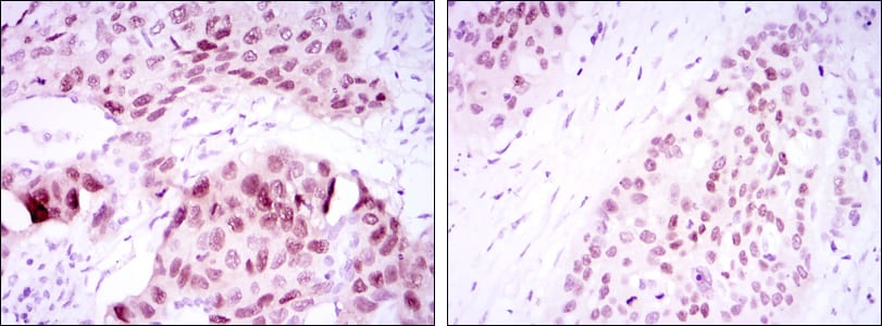Immunohistochemical analysis of paraffin-embedded human lung cancer tissues (left) and esophageal cancer tissues (right) using SOX2 mouse mAb with DAB staining.