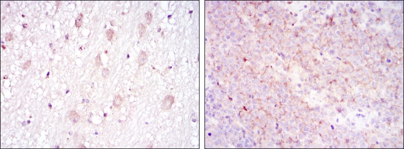 Immunohistochemical analysis of paraffin-embedded human brain tissues (left) and submaxillary tumor tissues (right) using CD1A mouse mAb with DAB staining.
