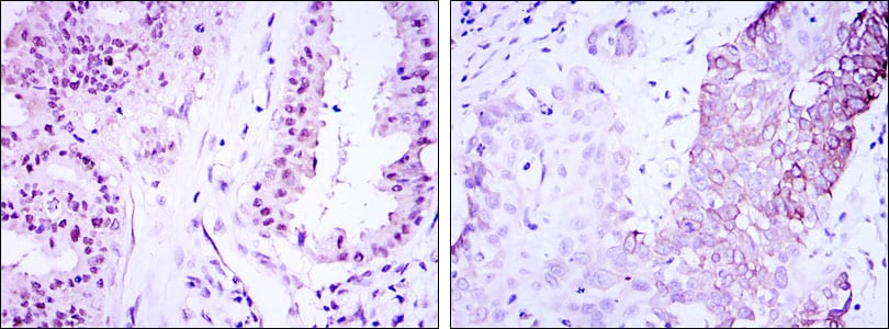 Immunohistochemical analysis of paraffin-embedded human lung cancer (left) and esophagus cancer (right) using CRTC3 mouse mAb with DAB staining.