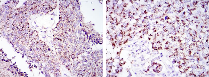 Immunohistochemical analysis of paraffin-embedded human lung cancer tissues (left) and kidney cancer tissues (right) using HSP60 mouse mAb with DAB staining.
