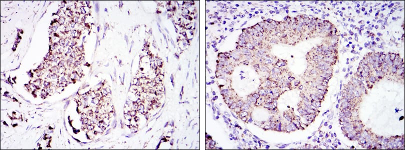 Immunohistochemical analysis of paraffin-embedded human breast cancer tissues (left) and colon cancer tissues (right) using HSP60 mouse mAb with DAB staining.