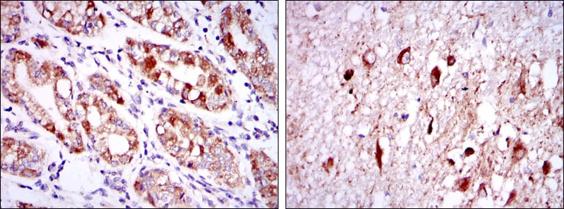 Immunohistochemical analysis of paraffin-embedded human stomach tissues (left) and brain tissues (right) using OTX2 mouse mAb with DAB staining.