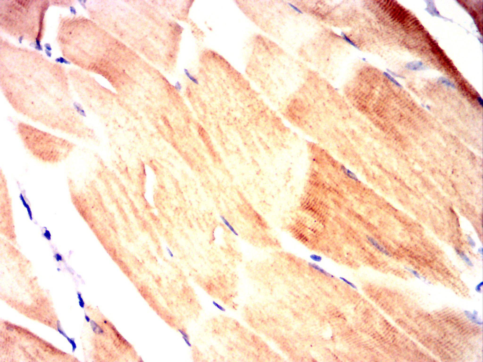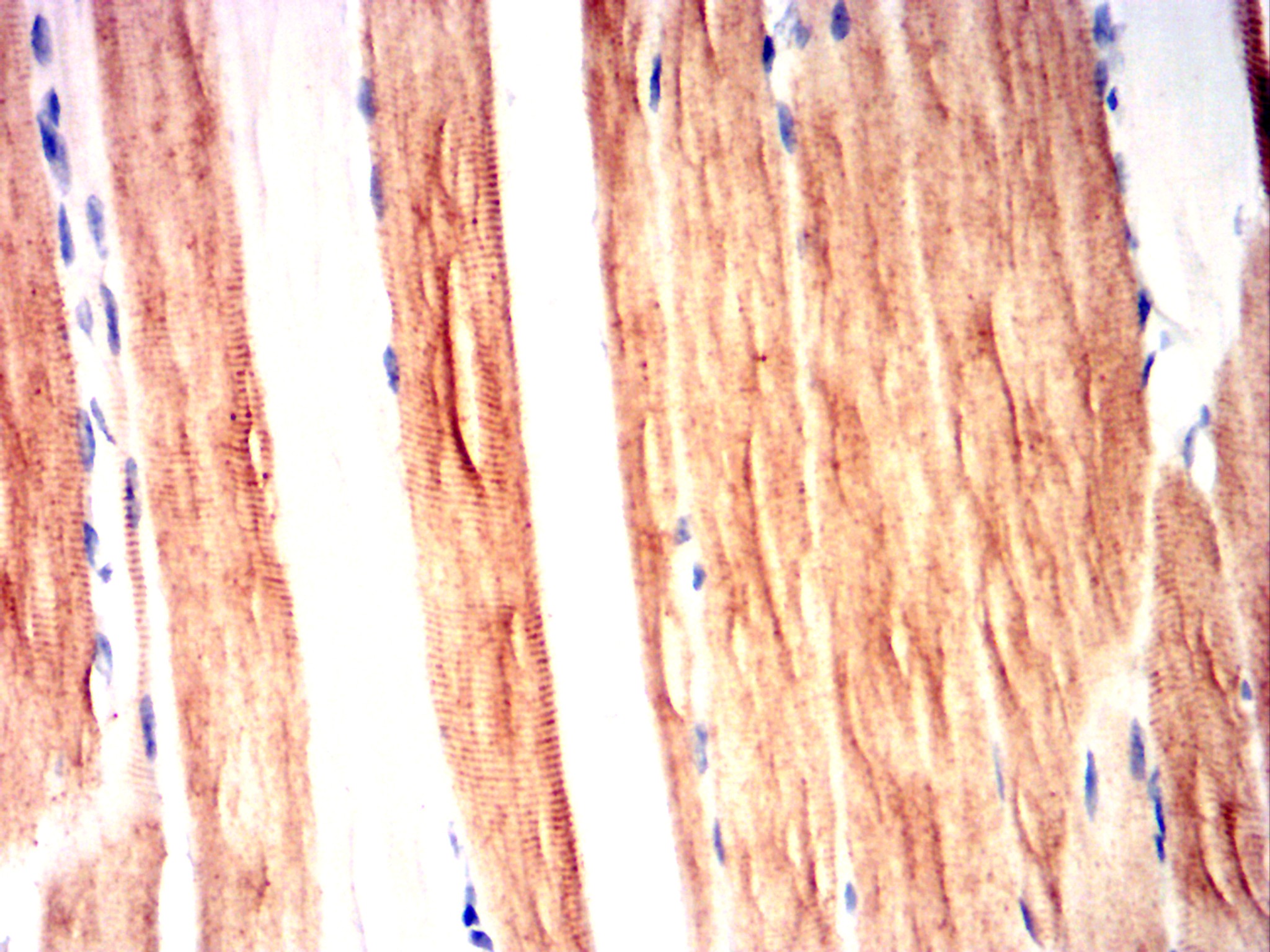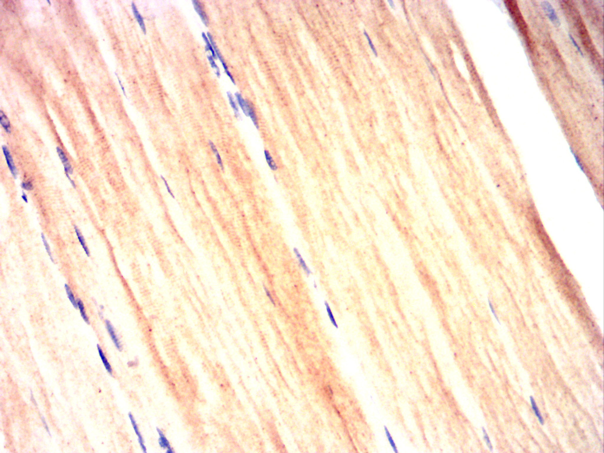 Immunohistochemical analysis of paraffin-embedded Rabbit muscle using ABCG2 mouse mAb with DAB staining.