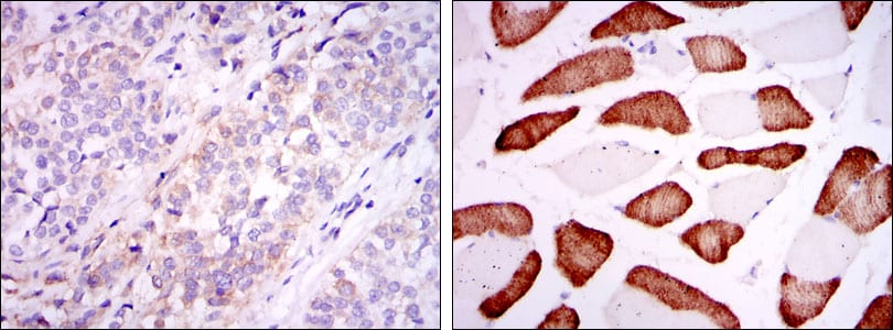 Immunohistochemical analysis of paraffin-embedded human bladder cancer tissues (left) and skeletal muscle tissues (right) using ABCG2 mouse mAb with DAB staining.