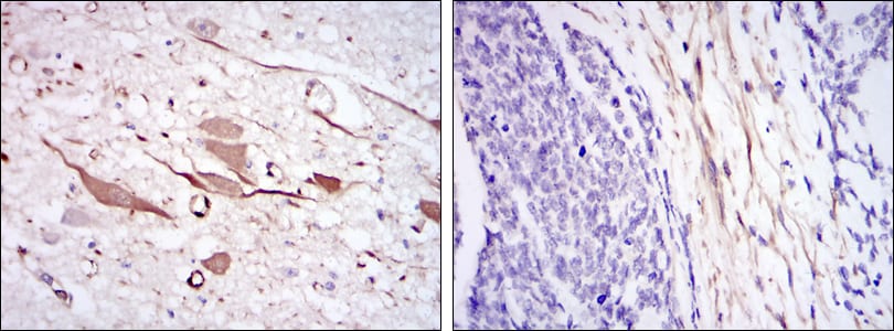 Immunohistochemical analysis of paraffin-embedded human brain tissues (left) and esophageal cancer tissues (right) using HSP27 mouse mAb with DAB staining.